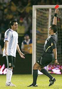 Jogando com um a menos desde o primeiro tempo, quando Tevez (foto) foi expulso, a Argentina foi derrotada pela Colômbia por 2 a 1, nesta terça-feira, fora de casa, e deixou de ter 100% de aproveitamento nas Eliminatórias à Copa do Mundo de 2010. Messi marcou para os visitantes, mas Bustos e Dairo Moreno viraram o placar .